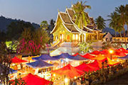 夕方18時頃から夜中までルアンプラバンのメインストリート・シーサワンウォン通りで毎日開催されています。路上いっぱいにテントが建てられ、観光客だけでなく地元民の楽しみにもなっています。土産物・民芸品・屋台などを眺めながら、夕日に照らされて輝くメコン河を眺めながら歩く遊歩道や街頭が少なく幻想的な雰囲気に包まれる夜の街並みもお楽しみください。*市内中心