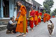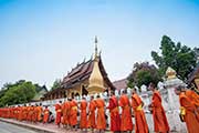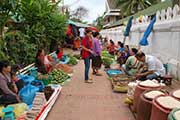毎朝早朝5時半、夜明けと共にオレンジ色の袈裟に身を包んだ僧侶たちの托鉢が始まります。托鉢とは仏教徒の修行の一つで、信者から生活に必要な最低限の食料などを乞うことで、信者にとっては古くからの伝統であり、先祖への供養や良い行いをすることで良い人生が待っているなどさまざまな意味があります。托鉢の後は朝市を見学、朝から活気あふれる市場は人々の生活を垣間見ることができます。*市内中心