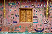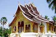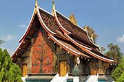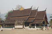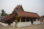 メコン河とナムカーン川が合流する半島のほぼ先端に建ち、ワット・マイ同様ルアンプラバン様式で建設された寺院です。九重の湾曲した屋根の独特な造りは荘厳で格式高い雰囲気があります。本堂の壁画や内部の展示品にいたるまで境内のいたるところに、色とりどりの細かな装飾が施されておりルアンプラバンで最も美しい寺院とも言われています。*市内中心