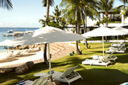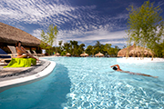 茅葺屋根が特徴の落ち着きある雰囲気のホテル。調度品も木製で自然派志向の方にはピッタリです。広々したプールに、すぐ前にはマリンスポーツや日光浴も楽しめる小島を所有しており、ゆったりくつろぎたい方はもちろん、アクティブに過したい方にもお薦めです。
